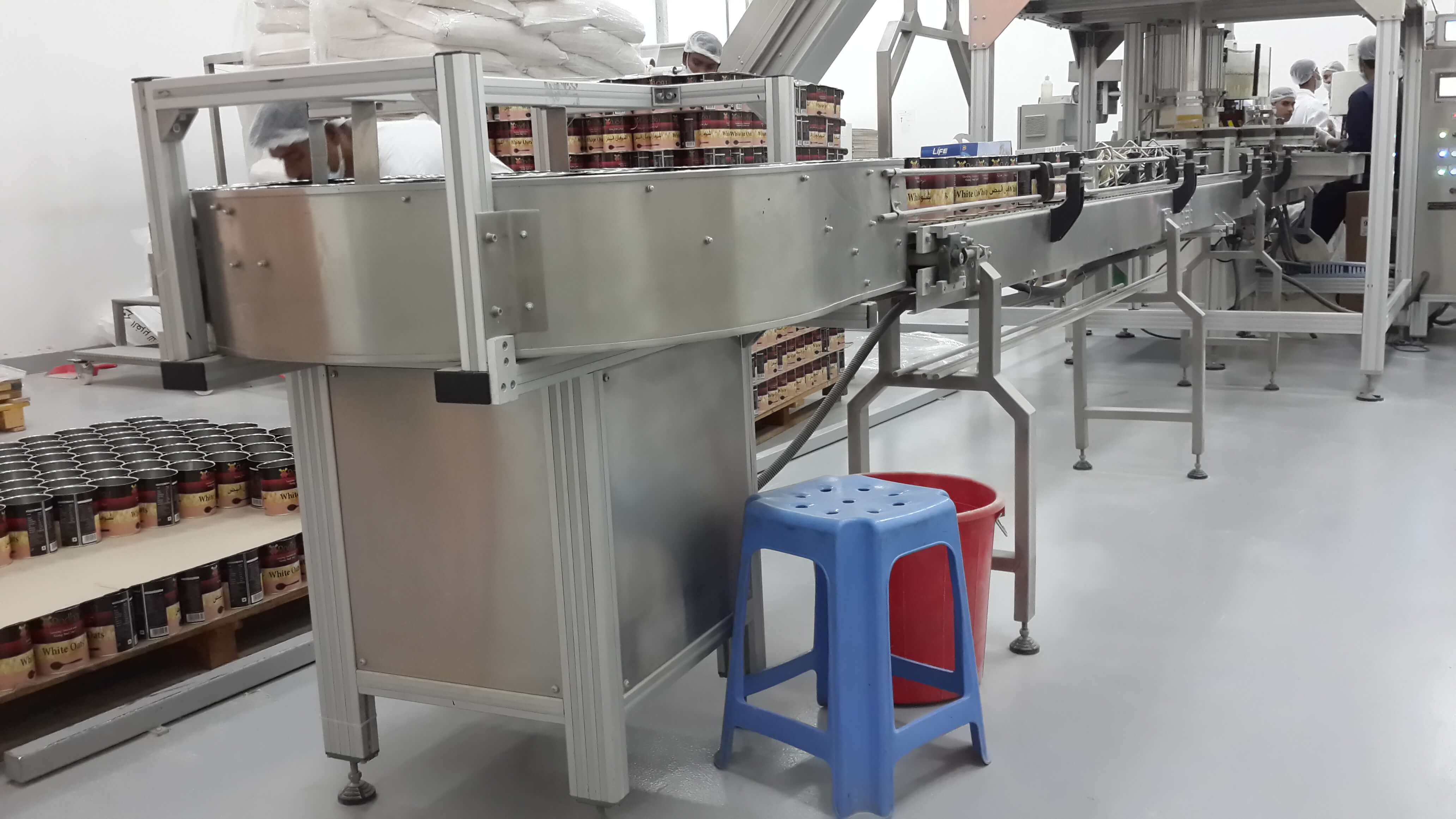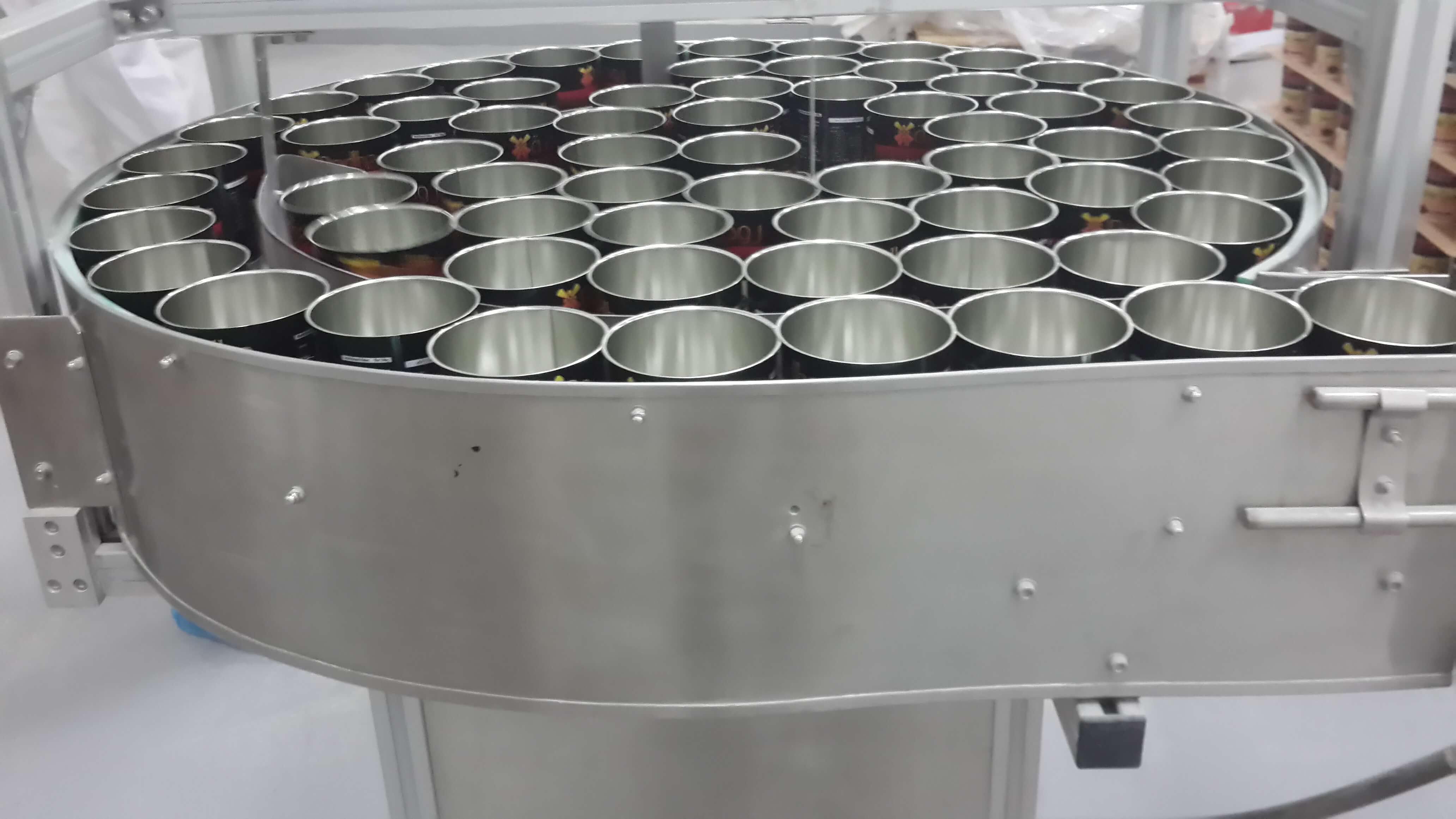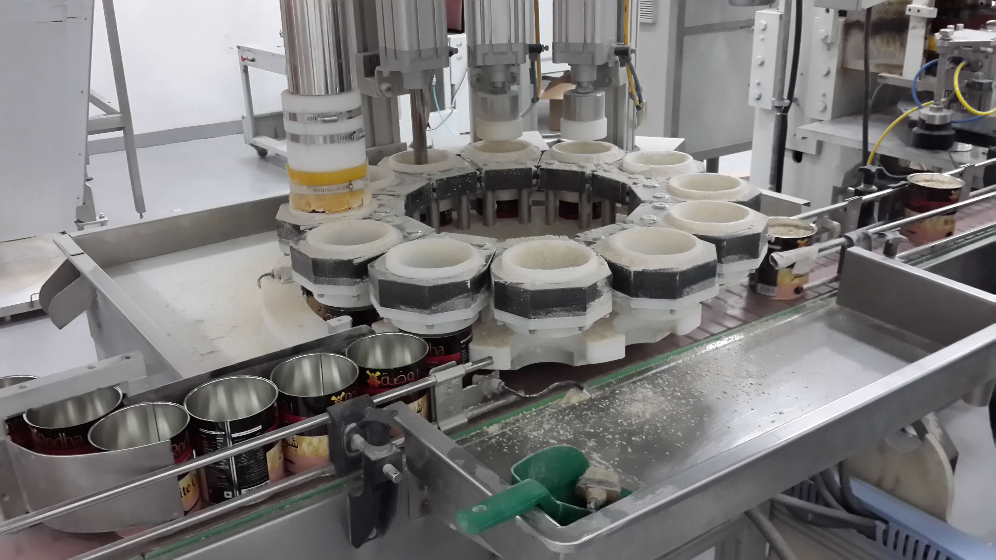 The tin gets cleaned with hot air by tilting downwards and forwarded to online Multi -Head combination weighing system provided at platform. The product is filled into Tin, then pressed with 400 kg of pressure without damaging the product and as well as the Tin. The servo motor driven heavy indexing station will forward the tin as programmed.
